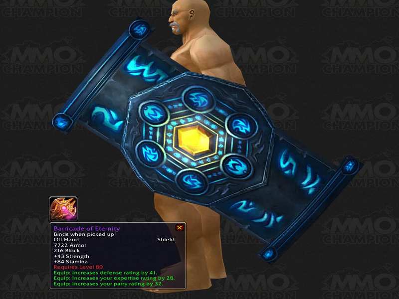 坦克盾 7722护甲 216格挡 43力量 84耐力 装备:提高防御等级41; 装备:提高你的精准等级28; 装备:提高你的招架等级32