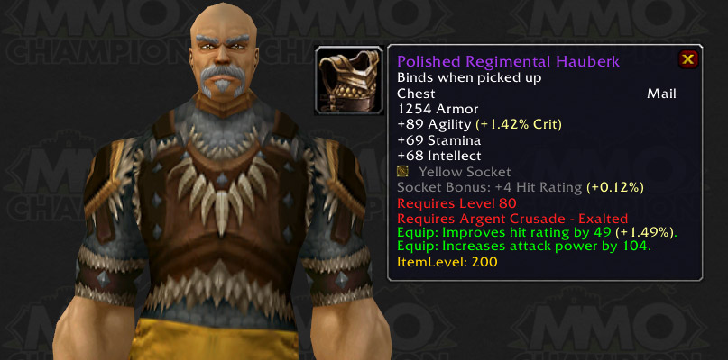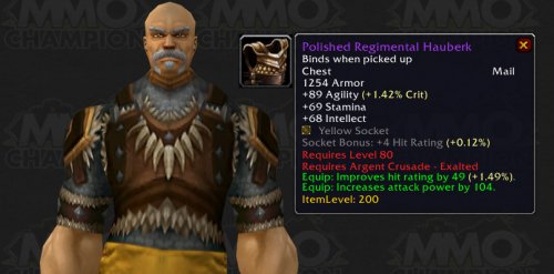 磨亮的戎装鳞甲 拾取后绑定 胸部 锁甲 1254护甲 +89敏捷 +69耐力 +68智力 黄色插槽 插槽奖励:+4命中等级 需要等级80 装备:增加命中等级49点 装备:增加攻击强度104点