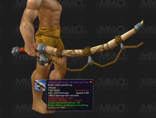 Mastercraft Kalu'ak Fishing Pole 拾取后绑定 双手 鱼竿 447-672伤害 速度3.00 (186.5秒伤) 需要钓鱼技能(300) 装备:增加钓鱼技能30点 装备:允许你水下呼吸