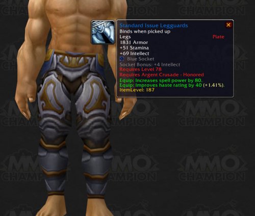 常规防护腿甲 拾取后绑定 腿部 板甲 1831护甲 +51耐力 +69智力 蓝色插槽 插槽奖励:+4智力 需要等级78 装备:增加法术能量80点 装备:增加急速等级40点