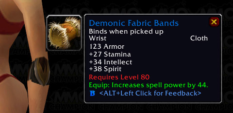 布甲手腕 123护甲 +27耐力 +34智力 +38精神 需要等级80 装备:增加法术强度44