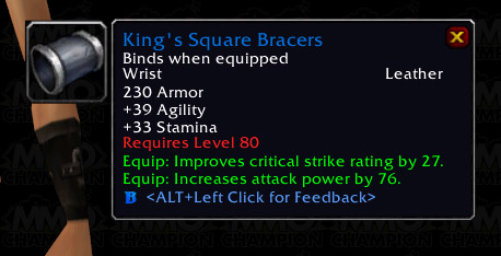 皮甲手腕 230护甲 +39敏捷 +33耐力 需要等级80 装备:增加暴击等级27 装备:增加攻击强度76