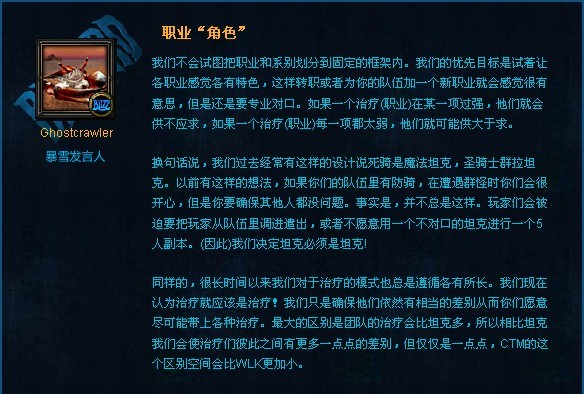 大灾变蓝贴,坦克和治疗职业距离将越来越少。我们的优先目标是试着让各职业感觉各有特色,这样转职或者为你的队伍加一个新职业就会感觉很有意思,但是还是要专业对口。如果一个治疗(职业)在某一项过强,他们就会供不应求,如果一个治疗(职业)每一项都太弱,他们就可能供大于求。 图一