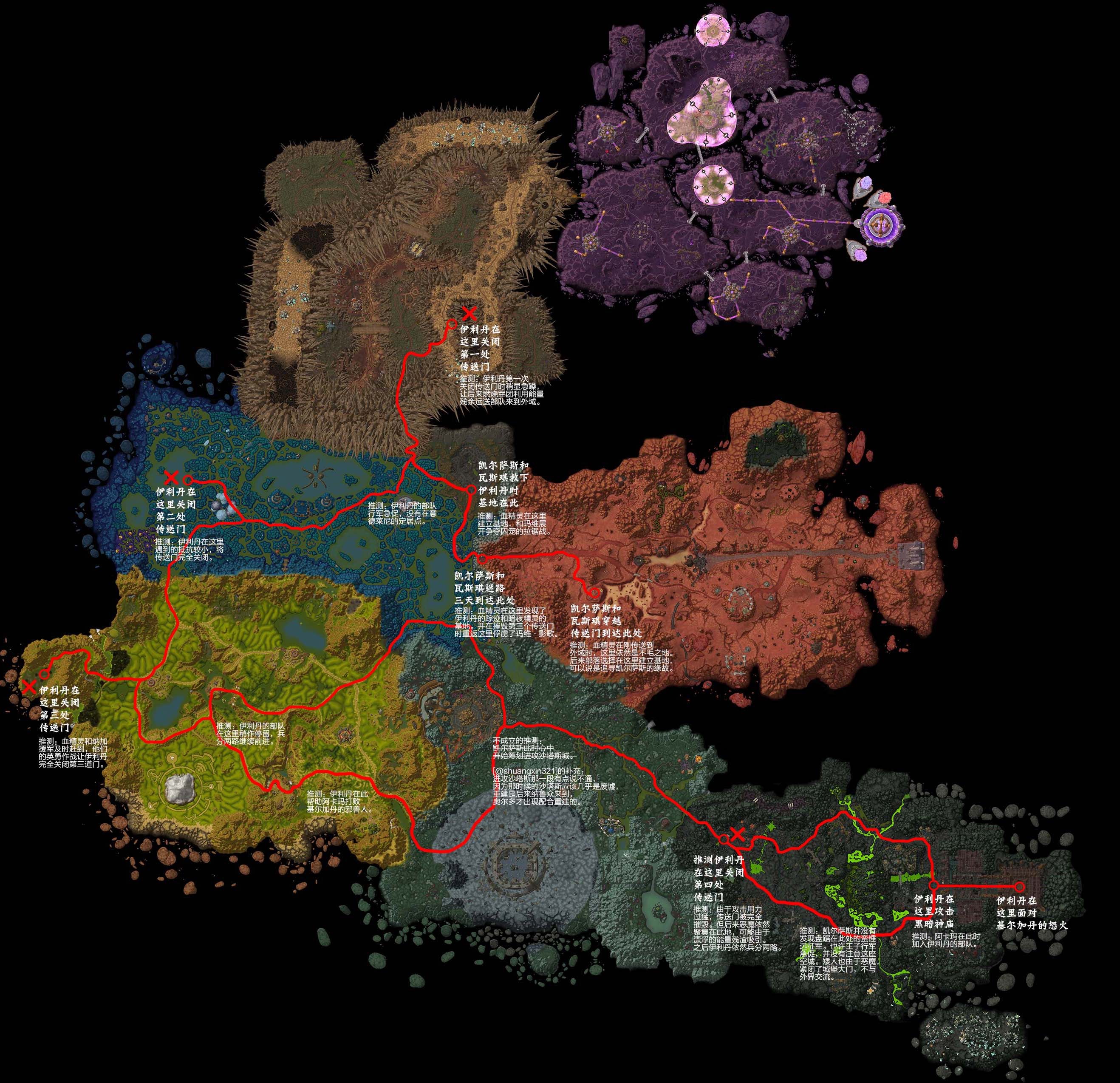 鉴于BLZ无节操的吃书加改设定,那些在混乱之治和冰封王座战役中出现的部分地点,在WOW世界中或者已经删除、或者已经更改了地理位置。但BLZ良心残余,依然有一些人在慢慢推进未来时间的同时,也在弥补以前的错误——注意他们主要是基于当下的时间线来整理过去。 本文就是用这种方法提出了假说,用到的一切资料基于冰封王座血精灵战役和魔兽世界,再加上个人的一点点脑补。 简述: 冰封王座联盟的战役是围绕血精灵领袖凯尔萨斯王子展开的。血精灵是一群在天灾入侵奎尔萨拉斯中幸存的高等精灵,虽然曾为联盟提供支援,但是被种族主义者、人类骑士加里瑟斯领主关押起来,最终被瓦斯琪女士和纳加营救。瓦斯琪带着凯尔萨斯前往外域,是为兽人世界德拉诺的残余,去面见(营救)她们的主人,伊利丹。在(又一次)抵挡住玛维并获得当地德莱尼人的效忠后,伊利丹拥有了控制外域的实力,希望那里可以成为他使用萨格拉斯之眼摧毁冰封王座失败后的避难所。但是他的主人,恶魔领主基尔加丹还是追踪到了他。伊利丹只得重新发誓毁灭巫妖王,血精灵的故事因此在冰封王座故事里暂时告一段落,直到燃烧的远征才续写。 战役梗概: 外域线是从第四关的过场动画开始的:凯尔萨斯初到外域,怀古一番后,就带着族人跟着瓦斯琪踏上了寻找伊利丹的旅途。在三天的无目的的寻找后,他们全都在地狱火半岛迷路了。 忽然他们双双感觉到周围的动静,并侦查出暗夜精灵的踪迹,也发现了囚笼里的伊利丹。他们立即与暗夜精灵展开了拉锯战,最终获得了胜利。瓦斯琪在随后向伊利丹引荐了凯尔萨斯,并欣然接受血精灵的加入。伊利丹向他的部下解释自己的行动:在摧毁冰封王座失败后,为了逃避基尔加丹的怒火前往外域避难。伊利丹要确保外域不再拥有基尔加丹的手下才能安心。 恶魔领主玛格瑟里登是伊利丹的主要目标。这个恶魔领主纠集了德拉诺爆炸后残余的兽人,控制了外域。耐奥祖的残留传送门也被利用来向外域传送大量的恶魔。为了击败玛格瑟里登,就必须先关闭他运兵的传送门,将其孤立在外域。传送门一共有四个,一个在现代的赞加沼泽、一个在现代的纳格兰、一个在现代的刀锋山,最后一个位置未知(也许被完全摧毁得渣都不剩了吧)。如今赞加沼泽和纳格兰的传送门被完全关闭并废弃,刀锋山的传送门依然有能量残余,为燃烧军团缓慢传送地狱犬部队,一个艾瑞达犬王负责稳定传送门。但这个过程最终被阻止了。 伊利丹在关闭四个传送门,得到阿卡玛的效忠后士气大振,随即在摧毁最后一扇门的当天对玛格瑟里登的城堡,黑暗神庙展开了进攻。在鏖战后,玛格瑟里登被击败,伊利丹成为黑暗神庙的主人,宣称自己为外域领主,接管了残余的邪兽人和恶魔。但是他的笑声很快就消失了,在战斗后的差不多一个小时后,基尔加丹就出现在伊利丹的面前,要求他完成自己的任务,毁灭巫妖王。 于是下图是凯尔萨斯的行军路线推测 PS:请猛击查看大图。 [编辑:网络]