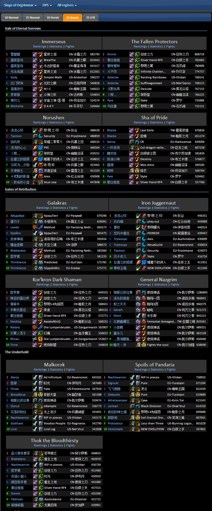 H决战奥格瑞玛首杀的结束,副本优势职业逐渐凸显。曾经60级的狂暴战、70级的双刀贼、80的火法橙斧战、85的橙杖法,到现在的术士,职业似乎一直都不平衡。 暴雪曾说过会平衡职业间DPS的差距,这个平衡似乎只在80级icc时代稍微接近过暴雪的说法。目前版本众所周知术士已成为副本DPS的首选了,而且暴雪在5.4版本来临之前也说过由于术士之前版本较为强势,在5.4版本会削弱。 最近暴雪又说过会削弱痛苦术士,但是一个职业三系天赋都强大的时代似乎只有3.0时代的DK,之后一刀一刀的被砍成渣。目前的术士已经成为3.0时代的DK,一代补丁一代神,术士们,有做好接受下一刀的准备吗? 嗯,WOL榜上除开坦克基本就是三系术士了! [编辑:网络]