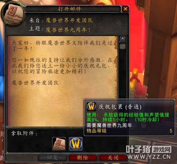 今天是魔兽世界九周年的日子,小编本以为暴雪今年会再次给与宠物之类的奖励,怀着激动的心情登陆游戏准备去领取呢,结果发现跟去年一样坑爹,仅有一个增加9%声望与经验的道具! 好吧,随着战友招募系统的重新启动,想必有大量玩家新建小号来玩,这一道具也还是有些用处的,大家赶紧上线领取吧! 活动时间:11月18日上午10:00——12月2日上午10:00