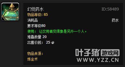 魔兽世界给玩家提供了许许多多有趣又萌呆的道具,例如诺格弗格药剂或是可以让你变身熊怪的达图尔的变形魔棒。而今天我们要介绍的,是资料片《大灾变》中加入的一个非常有趣的炼金配方——幻觉药水。制作方法很简单,只需要3个动燃生命,1个艾萨拉雾菇外加水晶瓶,但如果使用方法正确的话,喝下它的人就能在之后的2分钟内获得持续的欢乐。 该药水的说明里写着“让饮用者变得象是另外一个人”,但实际上它的作用机制更复杂一些。事实上幻觉药水会将你的样貌幻化为任何一个距离最近的玩家,用来打发RAID开始之前的无聊时光最好不过了,下面就让我们看看它能带来怎样的神奇功效吧。