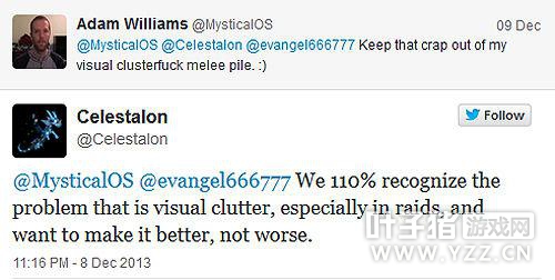 Celestalon:我们已经110%地察觉到了视觉混乱的问题,尤其是 在团队副本中,我们希望能对其进行改善,而不是使它变得更糟。 玩家们感到沮丧,因为除了降低视频设置里的特效以外,我们并没有什么好办法来解决这个问题。当团队战斗进行到激烈之处时,我们的显卡也承受着巨大的压力。特别是那些近战职业,华丽的特效直接让玩家“瞎了”——在玩家的事业中几乎看不清任何东西。在玩家们同时释放技能的时候这种情况尤为明显,比如输出战士释放雷霆一击外加剑刃风暴,同时惩戒骑打出了神圣风暴,当他们已经被巨大的紫色或是金色的泡泡包围时,术士的绿色火雨又从天而降,如果玩家因此漏掉了什么应该察觉到的东西,我一点也不会感到惊讶。场面实在太混乱了。如果这时候再加上一些BOSS技能或者萨满的治疗之雨,那么玩家就很容易看漏应该注意的细节。