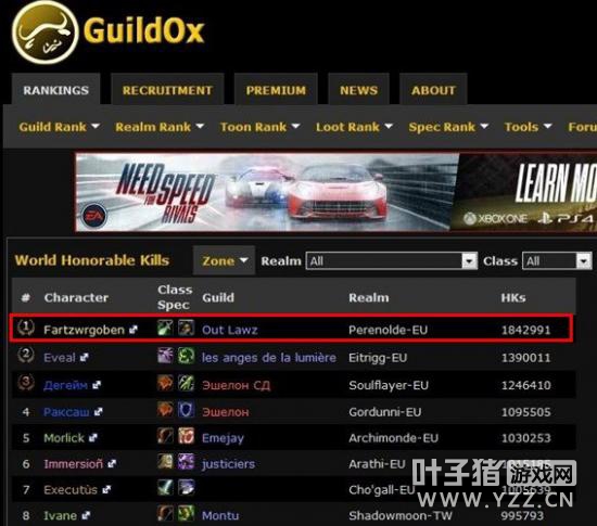 外服荣誉击杀排行榜 欧服盗贼184万排名第一