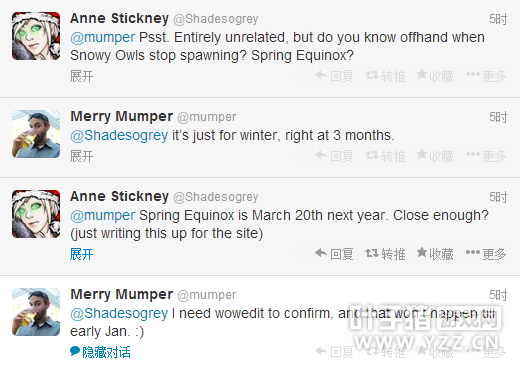 Q:你知道白色猫头鹰什么时候不再刷新吗?春分吗? A:它只在冬天刷新,3个月左右。 Q:春分是明年的3月20日,差不多吧? A:我需要用wowedit来确认一下,不过这事在年初1月之前都不会做的。:)(译者注:wowedit是暴雪所有的内部编辑器,用于创造和编辑从怪物到法术到任务的一切内容)