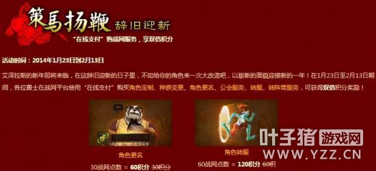 除了上面提到的大型抽奖,在1月23日至2月20日期间登录战网在线支付积分奖励平台即能免费领取新春红包一份,开启后有机会获得:白色小马缰绳/迅猛龙哨、夜刃豹幼崽、紫色河豚、愚人的金子、午餐篮、伊利丹之路、塞纳留斯之路以及一份小编现在还不能透露的神秘礼物。 战网在线支付积分双倍 在1月23日至2月12日期间购买角色定制、角色更名、转服、转阵营、种族变更战网服务将获得双倍战网积分。值得一提的是,在活动期间每花30个积分就能额外获得前面提到的战网红包一份。