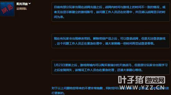 目前有部分玩家出现在战网充值之后,战网内时间与游戏上的时间不一致的情况,或者无法显示新建立的游戏账号,该问题工作人员还在处理中,并且请以战网显示的时间为准。 现在有玩家会出现修改密码、解除密保产品之后,可以登录战网,但是无法登录游戏,这个问题工作人员正在紧急处理中,请大家稍晚一些时间再尝试登录看看。 1月23日更新之后,游戏商城内可以购买泰瑞尔的天使战马,但是部分玩家会出现学习之后坐骑消失,该情况工作人员也在紧急处理,还请大家耐心等待。 对于以上问题给您带来的不便非常抱歉,同时您可以关注本帖,一旦有进一步的信息会进行更新的。 [编辑:不详]