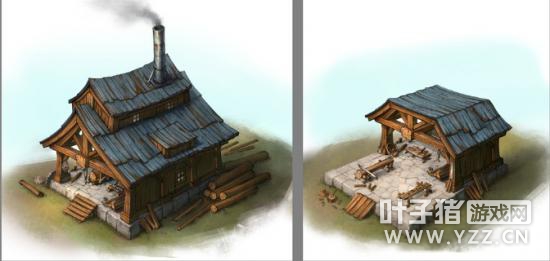 但在实践之后,我们发现这些建筑太眼熟了——它们不够酷,无法满足你对一个新的大型玩法的期待。于是我们又调整了策略——不再是简单地给旧房子刷上新涂料那么简单。 但这并不意味着我们抛弃了过去——那是我们的基础。在保留老建筑灵魂的基础上,我们开始尝试新的设计。我们绘制出了全新的原画,突出每幢建筑的个性,并制作出更拉风的升级版造型。这样,当你在建成第一幢名为伐木场的小屋(一个大号的木头箱子,里边有几根木头和一把钝锯子)时,你会很激动,但同时你也知道它还有很多进步的空间。随着你的实力逐渐壮大并最终建成三层高的伐木场时,你就会知道反攻钢铁部落的时机已经到来了。