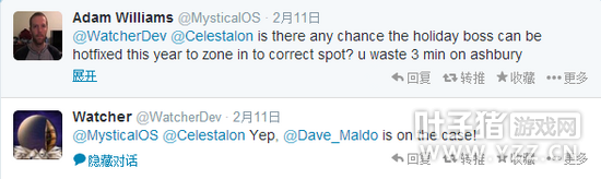 Q:今年情人节的节日BOSS会被在线修正放在正确的位置上么?(译者注:这里指需要NPC开门,目前此问题已修复,详情点击>>13日在线修正:进入情人节副本初始位置改动) A:是的。@Dave Maldonado正在着手处理此事!(译者注:Dave Maldonado是负责场景战役和世界事件的高级游戏设计师)