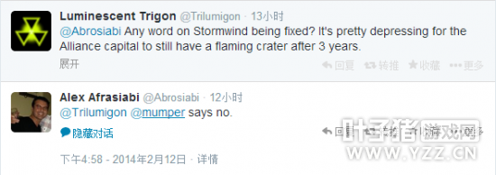 Q:有修复暴风城的消息么?3年过去了,联盟的都城仍然还有燃烧的大坑,真是令人沮丧。 A:@mumper 说不会修复。(译者注:mumper即Cory Stockton,魔兽世界首席内容设计师)