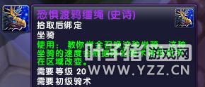 恐惧渡鸦的缰绳,20级可用,良心品质,看起来要比呆呆的魁麟好多了 在547的MPQ文件中 还发现了恐惧渡鸦的其他动作文件,如4种攻击、奔跑、跳跃、空中死亡、死亡、跌落等。 故猜测它有可能在WOD中不仅仅以玩家坐骑的形式出现,有可能会是一个稀有,也有可能是某个BOSS的坐骑(例如魁麟和铁琼同学),还有可能像安苏一样,作为5人本或者是RAID的BOSS出现。 下面是一些小预览。(点击观看实际骑乘预览视频)