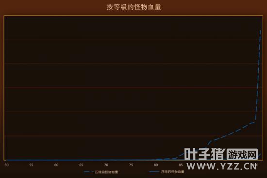 怪物生命值随等级而提升的走势:虚线为目前数值,实线为压缩后数值 译者注:从图上可以很清楚的看出属性压缩后1-100级的数值上升趋势已经没有过去9年来这么夸张:每个版本一次属性暴增的情况不会出现了。不过根据解释,你现在有多强压缩后还是有多强,那么旧世装备恐怕依然不能作为实用品重新登上舞台。 [编辑:不详]
