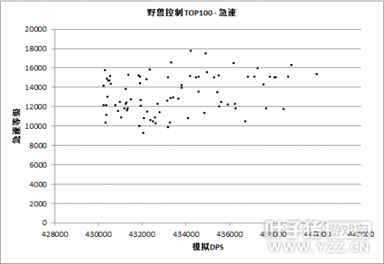 最后这张图是想提供为兽王的属性收益峰值分析提供一些真实的例证。图中的散点为模拟DPS前100的急速等级和DPS,基本都落在之前算出的最佳收益点附近。
