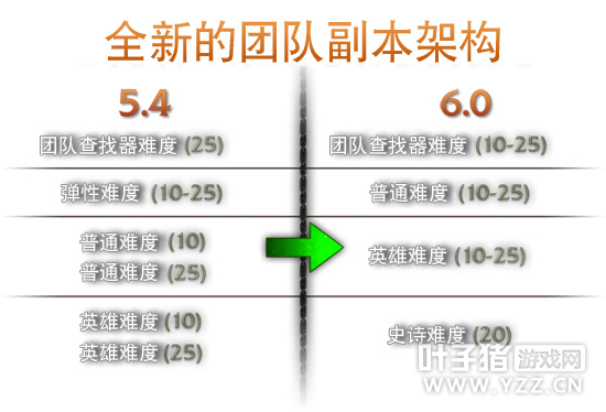 新增史诗难度(mythic):由现在的英雄模式转变而来,仅限20人参与,属于最高端的PVE内容; 英雄模式:由现在的普通模式转变而来,参与人数类弹性(10-25均可参与,下同); 普通模式:由现在的弹性模式转变而来,参与人数类弹性; 随机模式:依然同现在的随机模式,参与人数类弹性。 每个难度有独自的CD,只有随机模式需要排队进入,其他的副本难度不会出现在排队列表,需要你自己飞进本。装备掉落数量以参与副本人数来定,团长可以决定采取哪种掉落方式(个人独立拾取or传统掉落),精确到小数点,小数点部分用概率解决。 副本模式全面弹性化,副本进度全面自由化(BOSS随便打,但是同一难度下每个BOSS的LOOT权只有一次),副本无法中途切换难度,除了最高的“史诗”难度(20人固定进度),其他难度(随机,普通,英雄)都可以跨服组队(10-25人)。