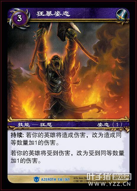 我大狂暴战在此,谁人敢挡! 3.0.5版本,泰坦之握正式加入《魔兽世界》,作为狂暴天赋的终极天赋,使得狂暴战士可以双持双手武器,狂暴姿态输出有了很大的提升。慢慢的,双持双手武器也成了狂暴姿态、狂暴天赋的代表性标志。(后期加入了针对单手武器的一心狂怒天赋,使单手武器伤害有所提升。) 《熊猫人之谜》版本,是狂暴姿态唯一一次大幅调整,取消了受到伤害加成,同时取消了3%爆击和10%伤害加成,但结果是与战斗姿态几乎一样,且效果还不如战斗姿态,逐渐淡出玩家视野。 《德拉诺之王》中,与战斗姿态冲突的狂暴姿态即将被砍。 墓志铭 失去了暴怒的灵魂,战士是否会失去自己奋斗的方向? 印象 狂暴姿态一直是笔者最喜欢的战士姿态,无视受到的伤害,如狂风暴雨般的猛攻对手,这比较符合战士的无畏冲锋精神。 魔兽世界里,最具代表性的狂暴战NPC,非格罗玛什·地狱咆哮(格罗姆为其昵称)莫属,无视自己的伤害,狂暴冲锋,斩杀了比自己要强力许多的深渊领主玛诺洛斯。 在围攻奥格瑞玛副本中,8号Boss纳兹格林将军,也是一个典型的战士,战斗、狂暴、防御姿态在战斗中应用自如,而狂暴姿态也正如我们常用的狂暴姿态效果——伤害大幅提高,同时受到伤害增加。(笔者有个问题,如果战士不再拥有狂暴姿态,那纳兹格林将军的战斗是不是可以少一个阶段?!) 推荐一个非魔兽的狂暴战代言人?我推荐《战神》的奎托斯,谁敢反对! 其他经历 在TCG卡牌中,狂暴姿态作为战士卡牌出现,效果为攻击或受到伤害时,均会获得额外1点效果。