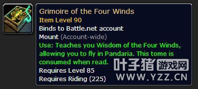 [四风魔法书]:战网通行证绑定,账号通用,使用:教会你四风的智慧,允许你在潘达利亚飞行。书籍在阅读后消失。需要等级85.需要骑术225。 编者注:寒冷天气飞行宝典再现。以后小号有福利了。