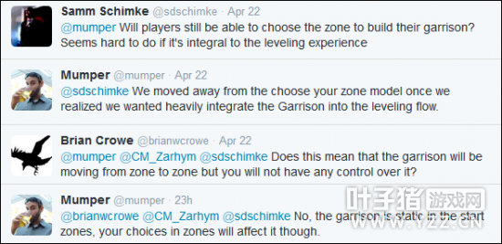Samm Schimke:玩家还能自行选择要塞的建造位置吗?感觉这挺难和升级过程配合上嘛 Mumper:为了让要塞更好的融入升级过程,我们已经砍掉了让玩家自行选择要塞建造区域的设定。 Brian Crowe:是说要塞还是可以更换建造区域,只不过玩家不能控制了? Mumper:是的,要塞现在始终位于德拉诺起始区域,不过你在各区域里的行动选择会影响到要塞。 其他相关蓝贴 Q:满级以后会开放要塞移动功能么,或者用任务,摧毁重建?消耗时间和资源。 A:我们正在讨论 Q:你是说,部落角色无论喜欢与否,都要卡在这冰天雪地里了? Q:为了升级要塞,我们是不是至少要把每个区域的主线任务做掉? Q:到底出啥事啦,怎么都不能选啦?选不选感觉无所谓,不过多少还是少了一份乐趣。 Q:能不能让角色多学一些商业技能,这样就不用开一堆小号了? Q:能说清楚点吗,是4个额外专业,还是一共4个专业? Q:那要塞的专业和角色的专业有区别么,还是说只是看起来像? Q:说好的种族主题要塞呢?还是说部落都是兽人范? Q:在其他地图时可以方便快捷地回要塞么?
