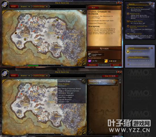 德拉诺之王延续了永恒岛的宝藏与稀有怪的模式。霜火岭有33个稀有怪和41个宝藏,相比之下永恒岛有33个稀有怪和区区10个宝藏。在某些区域里还有组队任务。 每个区域都有一条故事任务线,外加作为可选的支线任务和额外任务目标。当玩家进入相关区域时额外任务就会自动弹出来。 新的任务模式将会直接显示主任务线的流程和章节,每个章节内有数个任务,因此不会再出现剧情链断层的问题了(如下图)