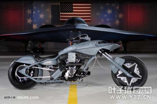 大名鼎鼎的B-2隐性轰炸机制造商诺斯洛普格鲁曼公司(Northrop Grumman)为了纪念B-2隐性轰炸机问世20周年,委托Paul父子设计了这部称为B-2隐形机车它的油箱与延伸的引擎盖设计的概念是轰炸机的特殊驾驶舱与机身,主要的元件都是采用B-2的颜色来上色。此外,车轮的每一边包含了5个B-2模组的铝材机构,排成美国空军(Air Force)的星星形状,每一模组都带有目前整个中队中20台B-2的尾号。