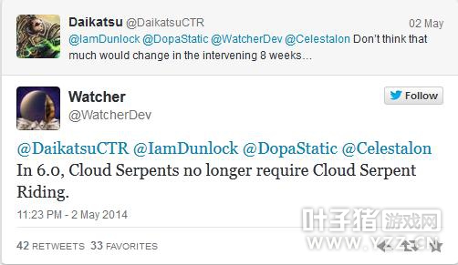 Daikatsu:上次蓝推过了8周了,估计变化不大。(注:指此前6.0翔龙坐骑依然需要骑士团声望的蓝推) Watcher:在6.0里,云端翔龙不再需要云端翔龙骑术。 是的,在2月底,Helen Cheng曾表示,云端翔龙暂无调整。不过似乎经过这8周的进一步开发后,暴雪已经决定砍掉云端翔龙这一骑术要求。不过,大概云端翔龙本身还是要刷骑士团声望才能购买的。