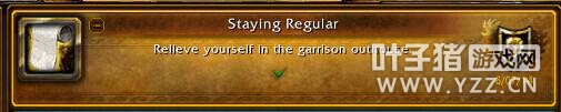 获得成就[保持规律] 上厕所的成就叫做[Staying Regular](保持规律),成就条件是:Relieve yourself in the garrison outhouse(亲自在要塞的厕所里方便——画外音:难道有谁不是亲自上厕所?)。不过,该成就并不奖励成就点数,成就分类为综合。