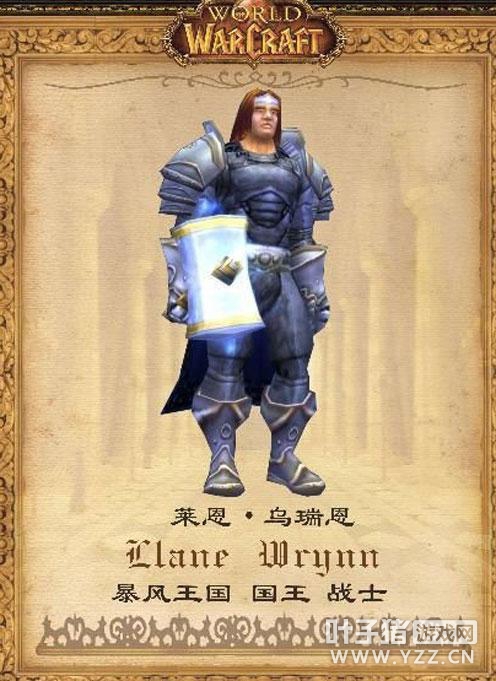 莱恩·乌瑞恩 作为艾泽拉斯王国至高无上的王,莱恩·乌瑞恩最是显的那么亲切和那么睿智。他和安度因·洛萨、麦迪文是童年好友。他在20岁加冕成为暴风城国 王,在他的管理下,艾泽拉斯王国十分的繁荣、人民十分安定。而这一切都被童年好友麦迪文破坏了,第一次兽人战争爆发。在击杀了麦迪文后,尊敬的国王死于兽 人刺客迦罗娜的匕首下,之后洛萨将莱恩国王葬于湖畔镇的湖底。