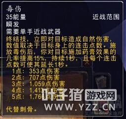786-818(暴击1508-1566) 致命毒药:每跳422-423(暴击845-846) 触发198-243(暴击418-461) 剔骨:2324-2904(暴击5993-6335) 3、输出循环改动: 也许是我大盗贼真的完美无缺。对于战斗贼来说。割裂取消几乎没有影响。输出手法也几乎没有变化。新天赋内出血对于BOSS输出毫无意义。 输出比例应该有较大变化,无MISS的白字伤害目前来看是最强的伤害了。所以切割一定不要断!属性依然是急速碾压。 唯 一值得一提的改动就是要害打击不再影响灯,并且要害伤害大幅提高,几乎到了和影袭持平的地步,唯一比影袭少的就是几率的2星。大家是否还记得曾经的飞镖控 灯流。现在靠要害打击也可以达到如此的效果。手动控灯使红灯配合上饰品触发或大技能。可以一定的提高输出。不过手法依然繁琐,不太熟练或比较懒的同学直接 按正常打差距也不大~ 100级天赋由于新补丁修改,92级无法点出故无法做出测试。 嗜毒成瘾:能量上限提高15点。每个被你施毒的敌人会使你的能量恢复速度提高5%,最多15%。 暗影反射:对目标召唤一个你的影子,持续8秒,影子会记录你8秒内使用的攻击技能,并在之后的8秒内复制。CD 2MIN。据说伤害是50% 天降杀机:消耗50能量,急速旋转,对8码范围内所有敌人最多造成1062(目前92级状态下)伤害,并非常酷炫的跳起对目标踢一骨,此剔骨多造成50%伤害。CD 20S。 目测战斗贼还是更偏向于暗影反射。当然,没测试过,仅仅是目测~ 五、刺杀天赋技能 1、技能改动: 蓝帖说斩击和毁伤将取消武器限制,不过目前A服上还是仅能匕首。 剧毒创伤不再能被锁喉触发,只有割裂可以触发。 升级获得被动,切割变为被动效果。