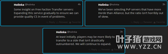 针对本次免费转阵营服务,魔兽世界首席战斗设计师Holinka也在推特中发表了自己的看法。Holinka称,目前免费转阵营服务器只是一个开端,在确保大量玩家使用本服务不会出现任何问题后,官方将继续扩大免费转阵营的服务器范围。至于免费转阵营的服务器选择标准,Holinka表示这些服务器的人口数量都是部落大于联盟,但是比例并不太失衡,都不是传说中的单阵营鬼服。Holinka认为,至少玩家们更倾向于选择那些不会太鬼的弱势阵营以寻求良好的游戏体验。