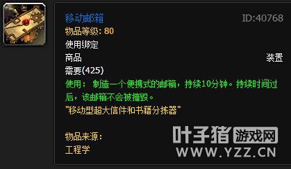 巫妖王之怒中工程学多了个移动邮箱图纸,这个邮箱居然叫MOLL-E,这个小装置来自《机器人总动员》里可爱的小机器人Wall-E。其说明是"邮件分拣机",而wall-E的功能是废品分拣,嗯,听起来差不多。