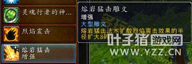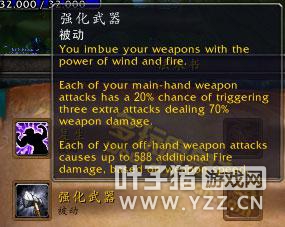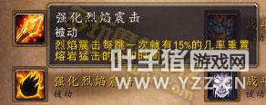 武器附魔的变化 武器附魔变成被动,结合了风怒和火舌武器效果。而石化武器与冰封武器则被移除。 6.0效果:每一次主手武器攻击有20%几率造成额外3次70%的武器伤害;每一次副手武器攻击造成基于武器速度的XXX点额外火焰伤害。