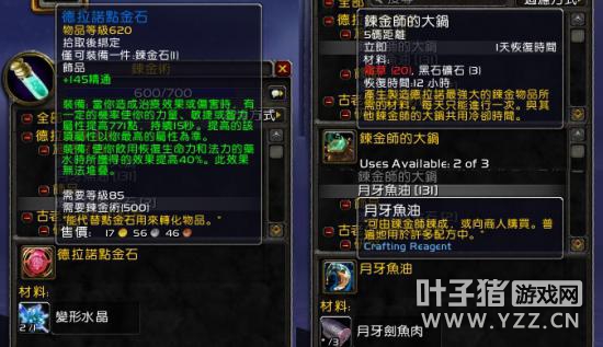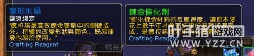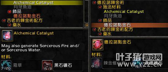 炼金催化剂现在是拾取绑定,一次制作出来5个,同时有几率出现新的通用材料巫术之水和巫术之火,这些都是制作新的精炼药剂的必要草料。同时炼金石的配方也有了变化,而月牙鱼油的配方则没有变化。 炼金实验室的作用 在要塞建立炼金实验室以后,那边有2个NPC,其中一个炼金师出售新的炼金配方: