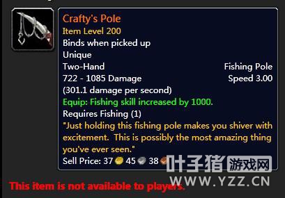 No.4 Crafty’sPole (机灵鬼的钓鱼竿) 装备:提高1000点钓鱼技能。 “光是拿着这根鱼竿就让你浑身充满兴奋。这可能是你所见过最令人惊叹的东西。” 有人说它能钓出死亡之翼,有人说它是春哥的牙签,有人说它是猎人的武器…… 我只能猜测是开发组用来测试钓鱼系统的东西…… 另外北风冻原中有一个侏儒妹子NPC,名叫机灵鬼沃比斯波基,可能跟这鱼竿有关系? |