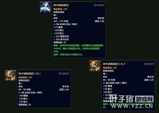 No.5 埃辛诺斯双刃 别太兴奋,这并不是伊利丹掉的蛋刀,而是那两把武器的前身。 暴雪在设计这两把武器的时候肯定有考虑过让两把“剑”合体的想法,这种武器可以转换形同的设定最终也落实在暗影之击/雷霆之击和祈福/咒逐上。有说法是这把武器是GM专用武器,但笔者并不那么认为。