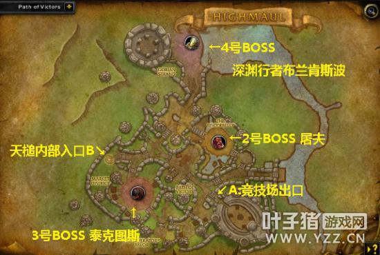 悬槌堡是T17的初级Raid本,拥有7个BOSS,分别是1号 卡加斯·刃拳、2号 屠夫、3号 泰克图斯、4号 深渊行者布兰肯斯波、5号 独眼魔双子、6号 邪能破坏者和7号 元首马尔高克。 玩家进入副本必须首先击杀1号BOSS卡加斯·刃拳,然后可以从2345任意一个BOSS开始选择开荒,其中234号BOSS是可选目标,击杀与否不影响尾王的击杀;而567号是线性击杀,必须击杀前面的BOSS,才能进行后面的。也就是说想打尾王最少只需要打156号这三个BOSS就可以了。 悬槌堡地图及BOSS分布