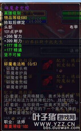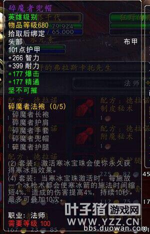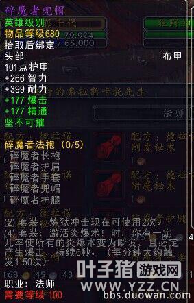 法师——碎魔者 奥术2件套:使用唤醒后,奥术冲击的施法时间和法力消耗均减少25%,持续15秒。 奥术4件套:当你获得一层奥术充能时,会有几率使你下一个奥术飞弹的飞弹数量增加5个。 火焰2件套:炼狱冲击现在可使用2次(注:2次充能,类似毁灭术的燃烧)。 火焰4件套:激活炎爆术!后,你有一定几率使所有炎爆术无施法时间,并且必定暴击,持续6秒。(每分钟触发几率大约1.50) 冰霜2件套:激活寒冰宝珠会是你永久获得寒冰指效果。 冰霜4件套:当寒冰宝珠激活时,每施放一个冰枪术都会使寒冰箭的施法时间减少4%,伤害提高4%,持续10秒,最多叠加10层。 造型: