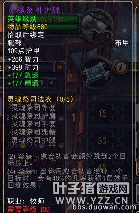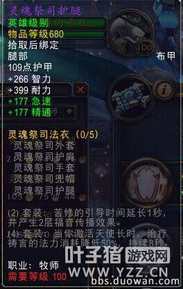 牧师——灵魂祭司 戒律2件套:苦修的引导时间延长1秒,并产生2层福音传播效果。 戒律4件套:当你激活天使长时,治疗祷言的法力消耗降低50%,持续8秒。 神圣2件套:愈合祷言会额外跳到2个目标身上。 神圣4件套:当你用愈合祷言治疗一个目标时,会有40%的几率获得一层妙手回春。 暗影2件套:每消耗一个暗影宝珠就会使心灵震爆的冷却时间缩短1.0秒。 暗影4件套:每当噬灵瘟疫造成持续性伤害时,你的急速会提高3%,持续4秒。该效果最多可叠加12次。 造型: