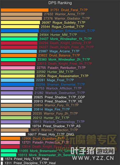 以下是《德拉诺之王》最新版本(18898build)的PDS模拟情况,模拟环境为T17团队副本。 模拟出来的DPS排名情况:野德最高,武器战与防战角斗姿态分获二、三,而输出专精最差的为使用100级天赋 [吉兆] 的暗牧。