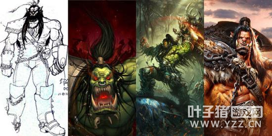 在这张图片上,我们可以清晰看到格罗姆这一英雄人物在外形上的进化:从Metzen原始设定中的大线条勾勒,到Glowei战歌峡谷时精细雕琢,格罗姆的形象在历代画师的笔下逐步丰富和凸显出来,直到德拉诺之王时达到顶峰:格罗姆的形象最终定格为伟岸雄壮、不怒自威。