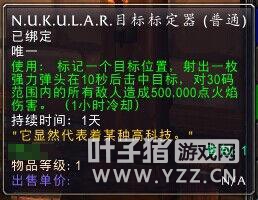 魔兽世界6.0要塞侏儒工厂曝光最新黑科技:N.U.K.U.L.A.R.目标标定器!该道具伤害相当恐怖,目前已有国服6.0内测玩家在阿什兰岛的团战中使用,效果十分强悍!下面就一起来看看这一道具的详细获取方式吧!! N.U.K.U.L.A.R.目标标定器 道具效果如下: