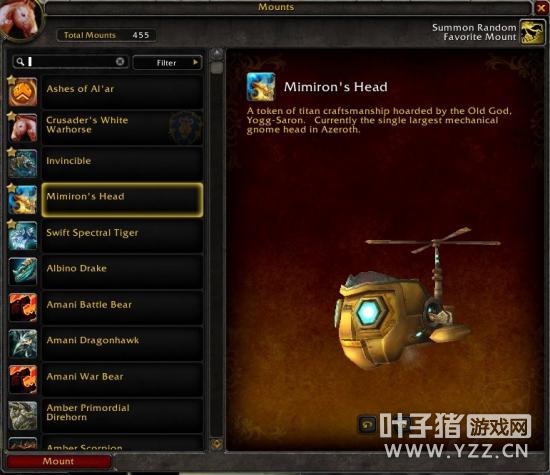 当你移动并且保持地图开着的时候,地图不会消失但是会变得透明; 你现在可以选择最喜欢的坐骑。这些坐骑会显示在坐骑列表的顶部并在其左上角会有星星的标志。你可以使用【召唤随机坐骑】按钮来随机召唤出你最爱的坐骑。 ● 坐骑列表会显示你账号中所有已收集到的坐骑,如果是对立阵营的坐骑也会显示,只是坐骑图表会显示红色提示玩家无法使用。同时背景中会显示联盟与部落的标志; ● 坐骑无法在特定区域内使用,比如水下坐骑,那么它会显示红色; ● 除了显示模型,它还会介绍额外的信息。每个坐骑都会有基本介绍,来源,相关类型级相关成就信息。比如你选择【米米尔隆的头颅】,那么它会显示以下信息。