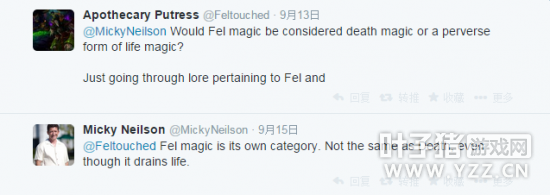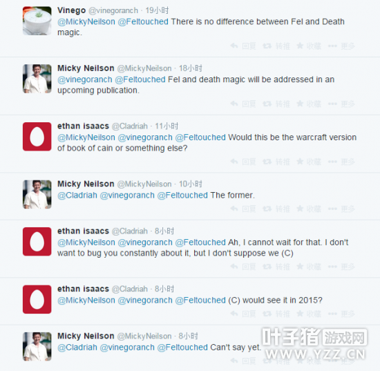 Q:我觉得邪能魔法和死亡魔法没什么分别。 A:邪能魔法和死亡魔法的问题将会在一本即将出版的书中得到解决。 Q:这本书是魔兽版的凯恩之书么,还是别的什么东西? A:前者。 Q:2015年能看到这本书么? A:现在还不能说。