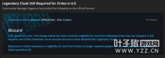 原来的6.0前夕版本改动中有一条说明,击杀永恒岛的斡耳朵斯将不再需要橙色披风限制。目前美服上线后,由于一些bug,该改动被取消了。 你仍然需要在战网通行证中有任意一个人物获得了传奇橙色披风来击杀斡耳朵斯。