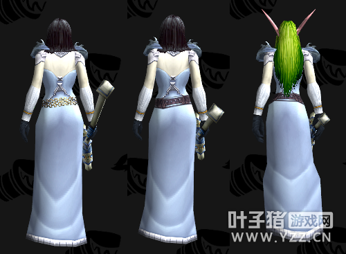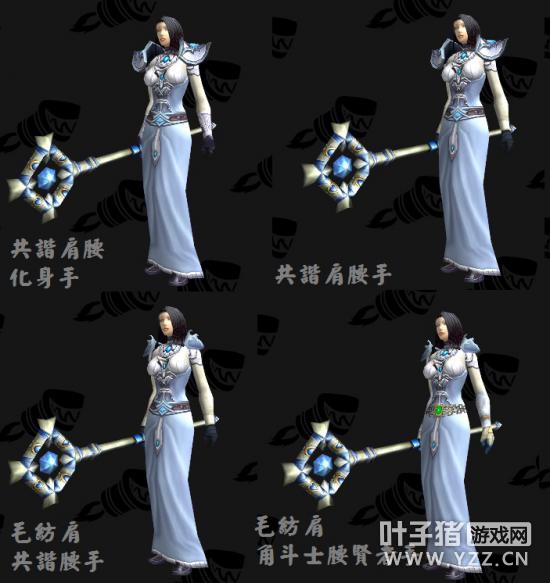 这套的中文翻译是共济套装,图中展示的部位分别是[共济肩章],[共济束带]和[共济手套]。不得不说,蓝白的配色以及点缀的蓝宝石都和月布长袍无比切合,如果说美工不是照着月布长袍来设计的这套我都有点不敢相信。 不过很可惜,共济肩膀虽然颜色简直不能再搭,但是其笨重粗大的外形似乎没有小巧玲珑的双线毛纺衬肩来的讨喜。相对应的,如果一时间拿不到共济手套的话,也可以用左上图的化身手套作为代替。 特意在右下角放了一个目前比较流行的搭配作为对比,个人感觉流行搭配美中不足的一点就是腰间的绿宝石总是透出一种若有若无的邪气,和月布的纯洁并非很和谐,但可惜在现阶段也没有更好的方案——这下WoD开放之后,就多了另一种配色上较完美的选择。 不过有得必有失,这个搭配也有一个致命缺点,就是...正脸不错看,但是背影里腰带的暗色显得很突兀。
