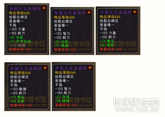 五人副本的掉落拾取方式也有所改变: 以前,副本BOSS掉落的装备都是独有的,但是现在许多BOSS都会掉落相同名字的装备,而唯一的区别是装等不同。举个例子:影月墓地的BOSS骨喉在普通模式下会掉落615装等的[金钢腰带],而英雄模式黑石塔上层的BOSS督军扎伊拉则会掉落630装等的[金钢腰带]。 另一个变化是BOSS的掉落面会更广。如果一个BOSS会掉落腰带,那么他一共能掉落五种不同护甲的腰带,而且每种护甲还有五种不同属性搭配(绿字属性不同),这些绿字属性是固定搭配而非随机生成。 另外普通模式的五人副本同样有机会出现稀有属性(第三属性,如吸血、坚不可摧) 稀有精英(620-626)每张地图都有100级精英,而所有100级的稀有精英都会掉落620的装备。与其他低级稀有不同,这些100级稀有精英每天都可拾取一次但并非100%掉落,且相同地点每天都会更换不同的怪物,另外有的稀有精英是阵营专属的。 这些稀有精英掉落的装备可能带有其他附属属性:战火(提升为626)、插槽或稀有属性。