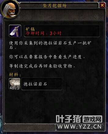 要塞订单 要塞中的很多建筑都可以下订单,比如矿洞、药圃或者专业的建筑等。这些订单可以根据建筑的等级提升可下订单多少,1级建筑可下7个订单,2级建筑可以下14个订单,3级建筑可以下21个订单。每个订单都有3小时的冷却时间。 收订单,每次看到要塞的小地图中有黄色的小点就说明订单已经完成,可以去收了。会自动拾取成品,成品订单中有一定几率出现巫术之火、巫术之水等材料以及少量的埃匹希斯水晶。